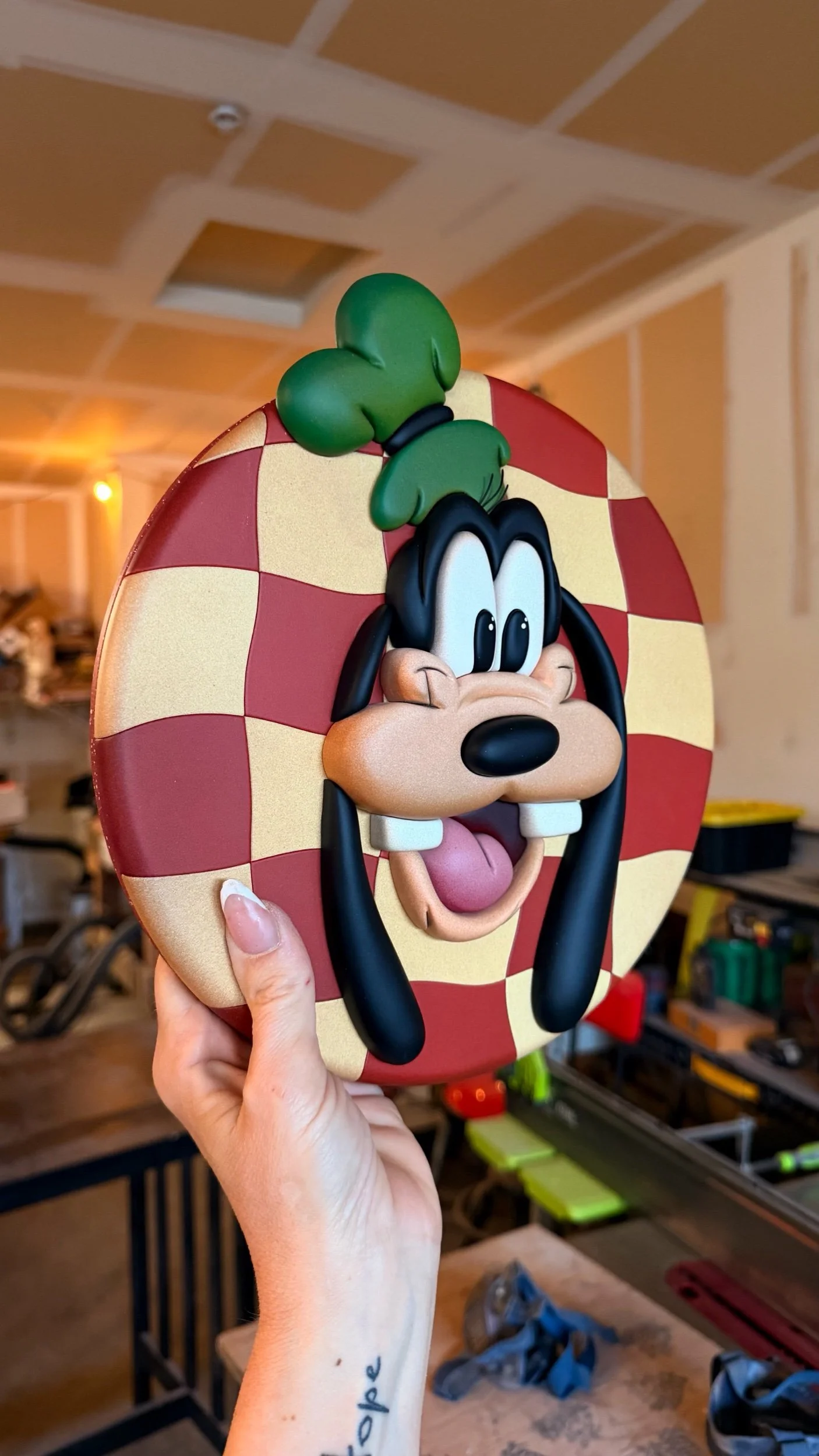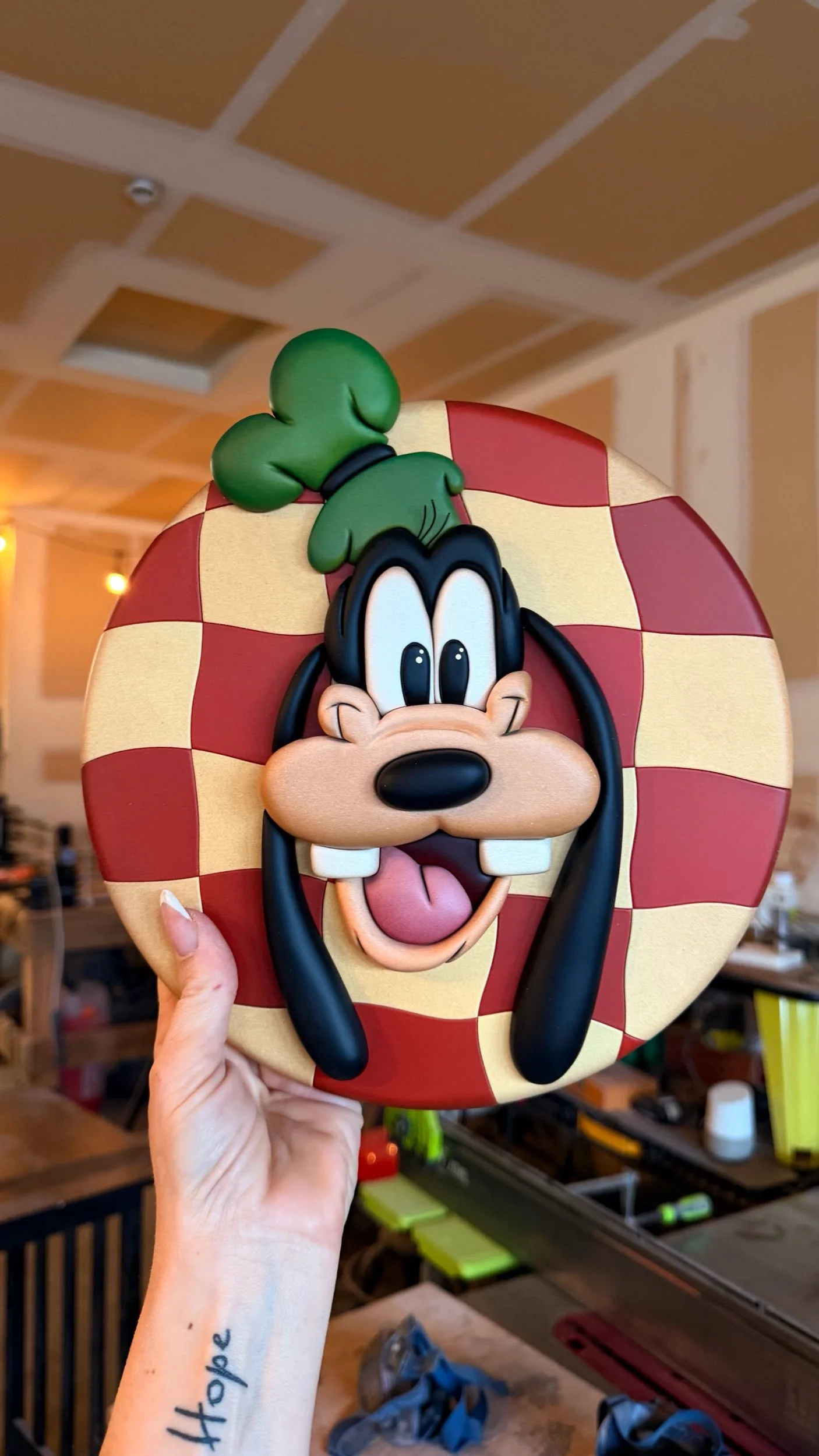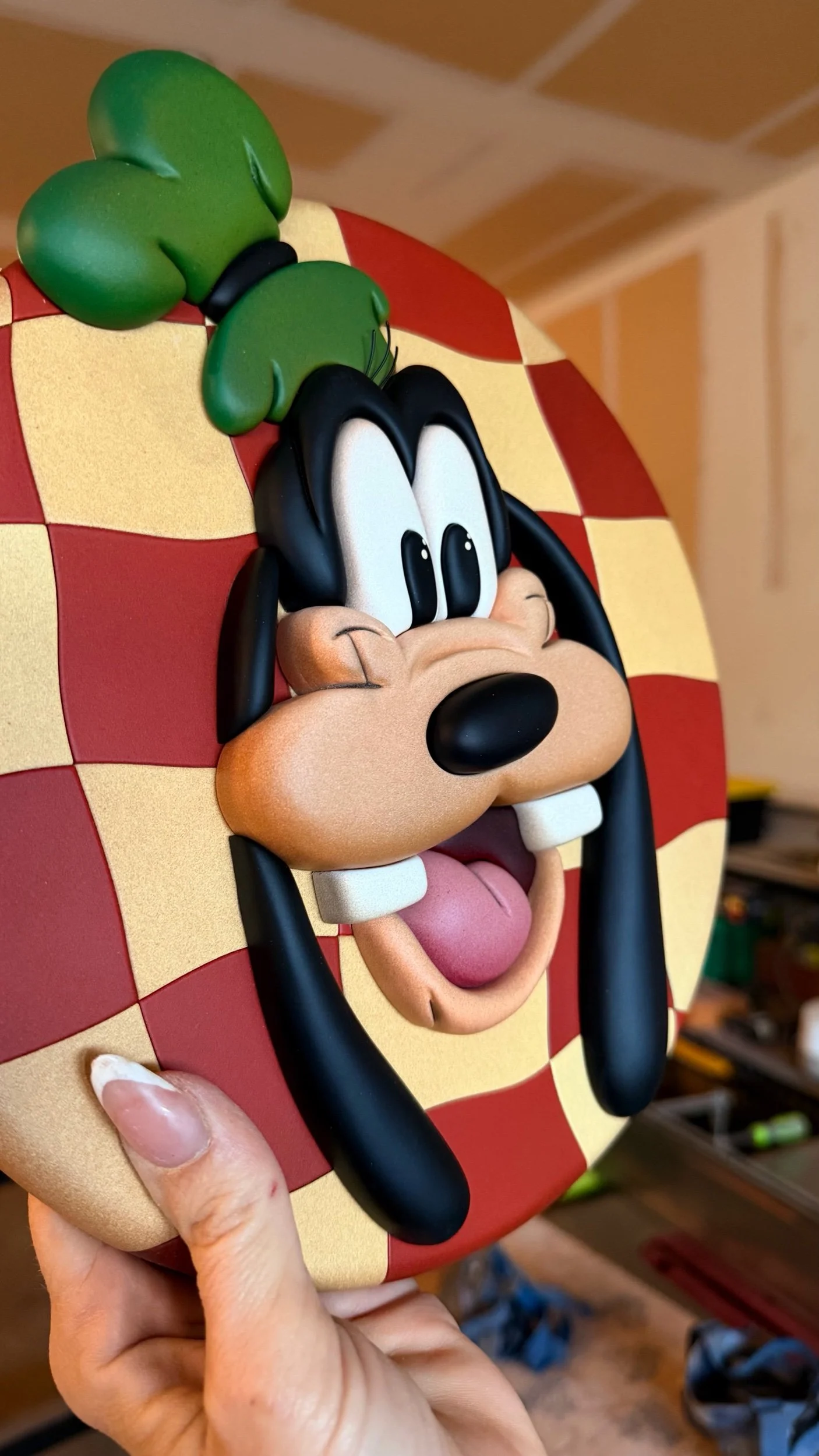 Your favorite silly character featured on a custom wavy checker print round. He’s got vibrant colors, a fun expression and a design that takes me back in time.