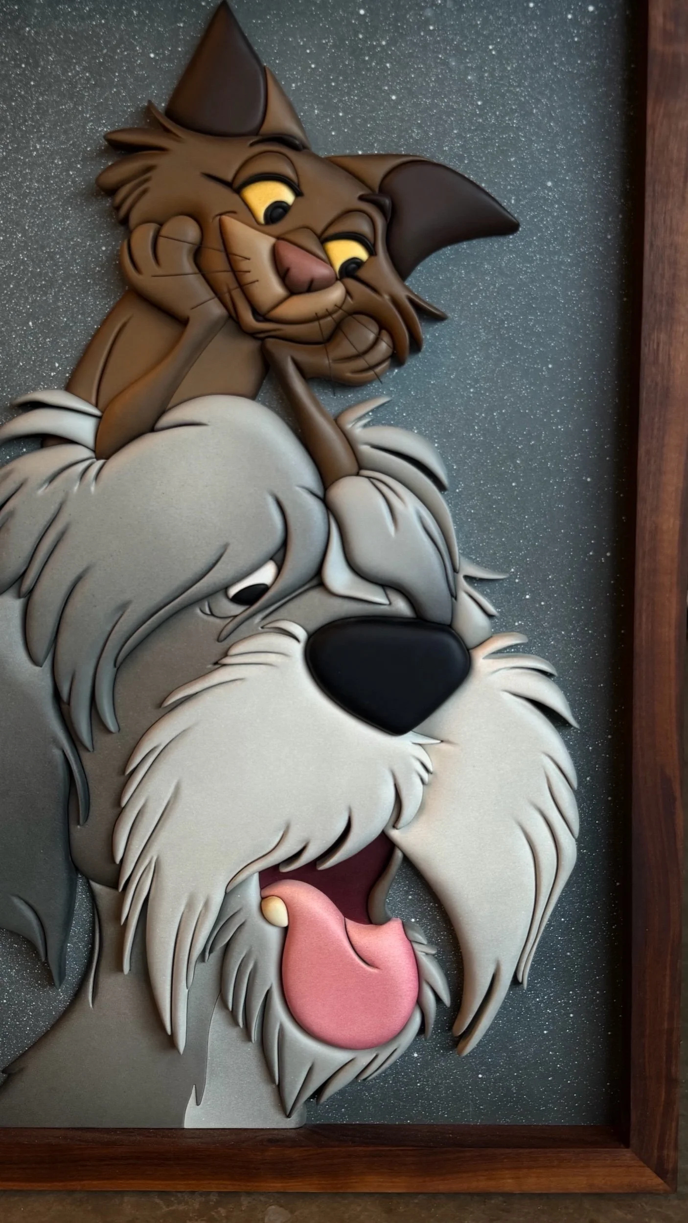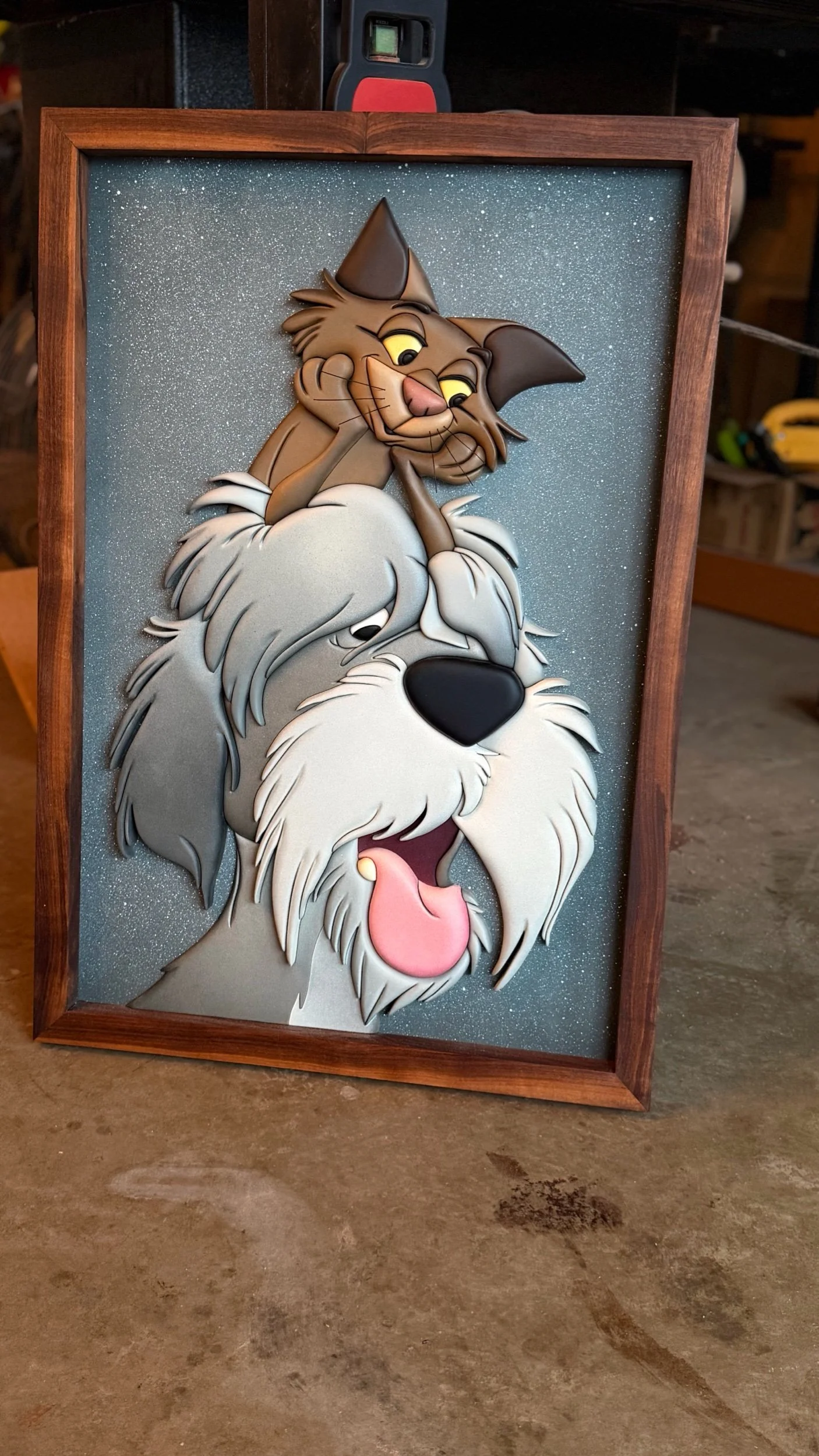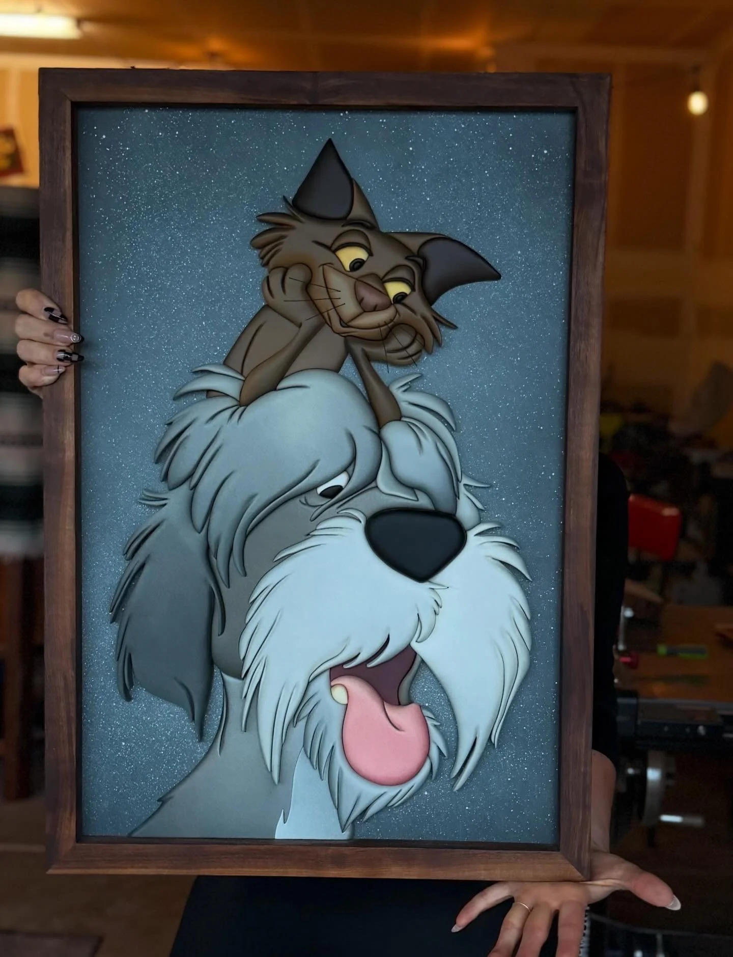 Take home two of the best teammates to guard your home. The snowy background gives a sense of comfort like watching movies as a child. The dark walnut frame gives rustic barn vibes. Colors look cooler or warmer depending on lighting. This piece is 100% handmade.